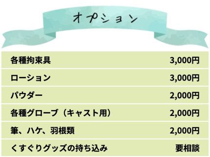 | 料金 | 【くすぐりフェザー(男性スタッフ1人)】 70分¥7,000 100分¥10,000 130分¥13,000 【ダブルセラピストのくすぐりフェザー(男性スタッフ2人)】 100分¥20,000 130分¥26,000 【オプション】 言葉責め バストくすぐり デリケートくすぐり |
