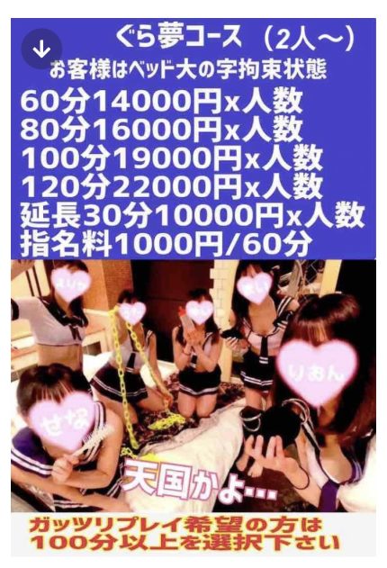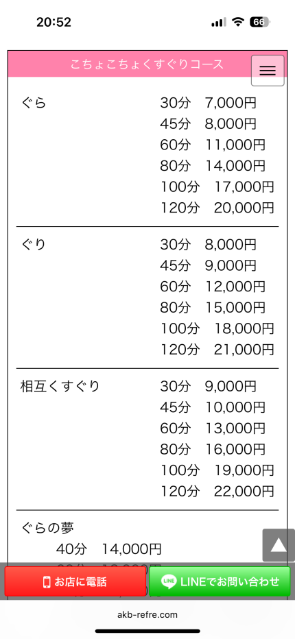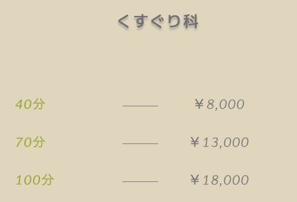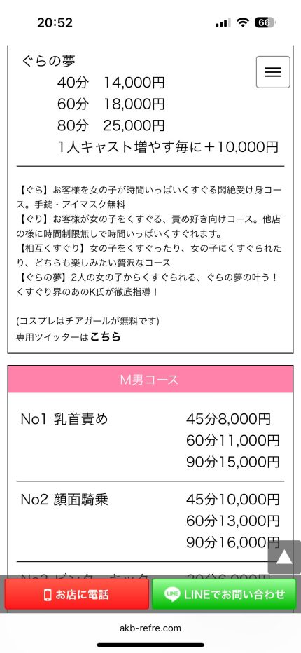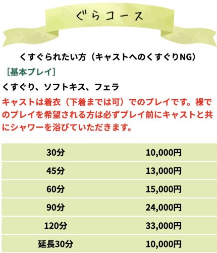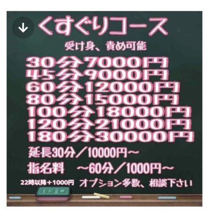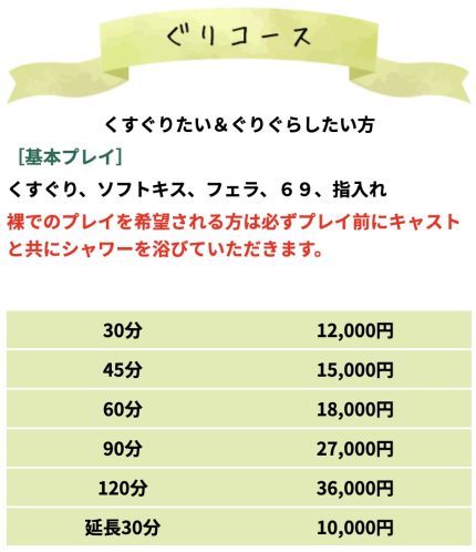 | 料金 | くすぐり回春堪能コース 65分 税込み18,700円 80分 税込み22,000円 100分 税込み28,600円 120分 税込み36,300円 |