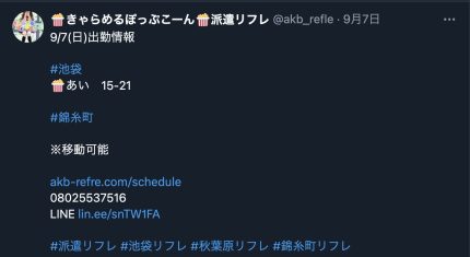 ・Xのアカウントで昼過ぎ頃に当日の出勤情報が公開される。出勤情報が公開されないときもある。